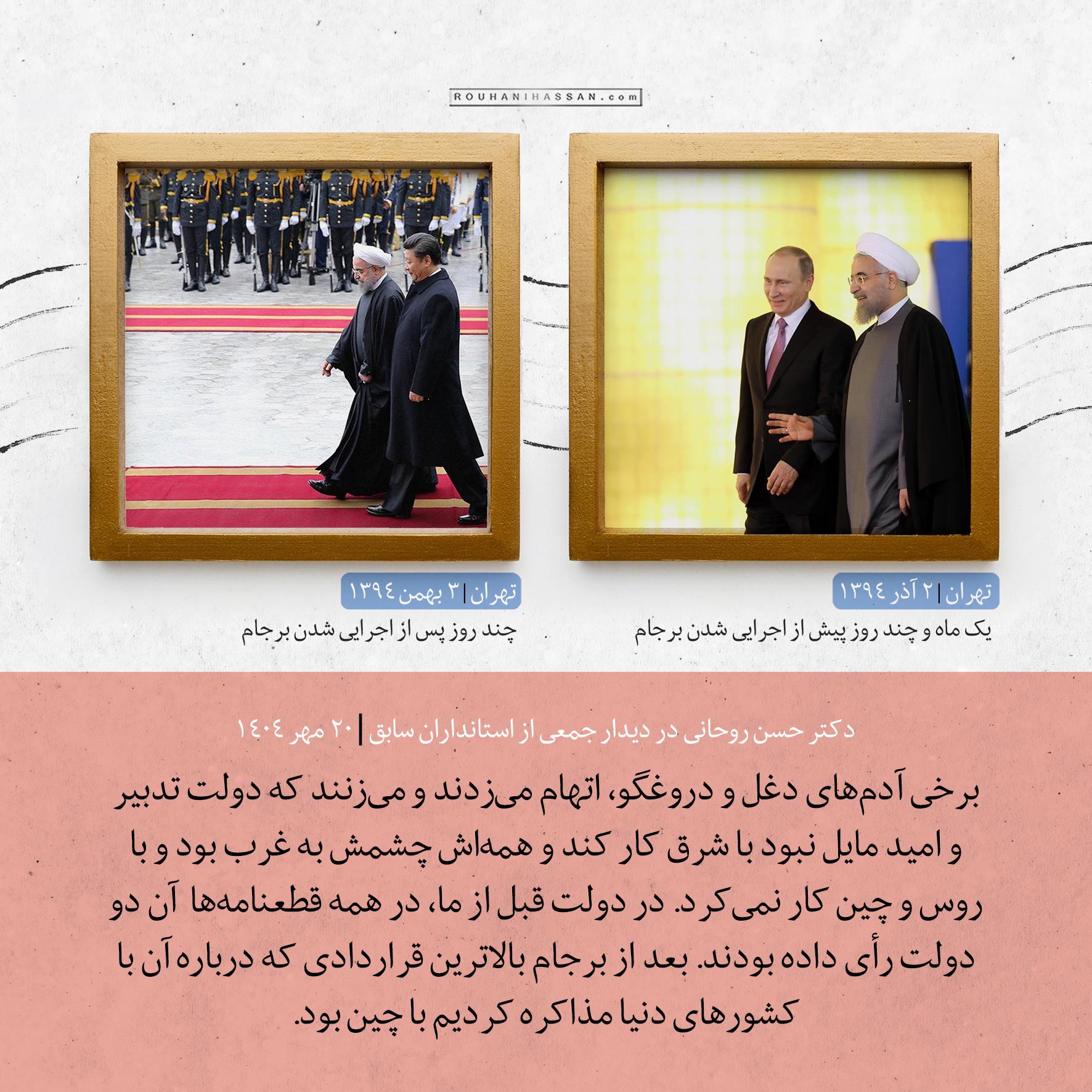 برخی آدمهای دغل و دروغگو، اتهام میزدند و میزنند که دولت تدبیر و امید مایل نبود با شرق کار کند و همهاش چشمش به غرب بود و با روس و چین کار نمیکرد. در دولت قبل از ما، در همه قطعنامهها آن دو دولت رأی داده بودند. بعد از برجام بالاترین قراردادی که درباره آن با کشورهای دنیا مذاکره کردیم با چین بود.