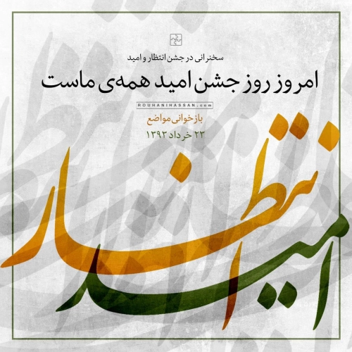 ما منتظریم، منتظر روزی که بیاید و افراط‌ها را برای همیشه پایان دهد/ به او می‌گوییم همچنان دلبسته او هستیم یا مهدی/ ما به او می‌گوییم همچنان در انتظار او چشم به راهیم یا صاحب‌الزمان/ ما به او می‌گوییم راه و مسیرش را برای ظهور هموار می‌سازیم/ ما به او می‌گوییم مهدی جان، از خرداد پارسال ملت ما با دست و با زبان توانمندش خرافه‌ها را زدود/ ملت ما سال گذشته به مولایش و امامش در انتخابات سر فرود آورد و در برابر خرافه‌گران از او، از امام عصر عذرخواهی کرد. [این جشن به مناسبت تقارن میلاد آخرین منجی بشریت و اولین سالروز انتخابات ۲۴ خرداد ۹۲ برگزار شد.]