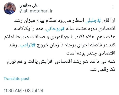 علی مطهری در شبکه اجتماعی ایکس نوشت: از آقای جلیلی انتظار می‌رود هنگام بیان میزان رشد اقتصادی دوره هشت ساله روحانی، همه را یک‌کاسه هفت دهم اعلام نکند. با جوانمردی و صداقت صریحاً اعلام کند در فاصله اجرای برجام تا زمان خروج ترامپ، رشد اقتصادی چقدر بوده است. همه می‌دانند هم رشد اقتصادی افزایش یافت و هم تورم تک‌رقمی شد.