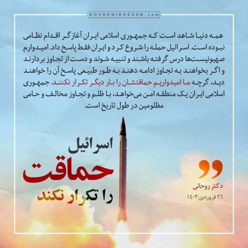 همه دنیا شاهد است که جمهوری اسلامی ایران آغازگر اقدام نظامی نبوده است. اسرائیل حمله را شروع کرد و ایران فقط پاسخ داد. امیدوارم صهیونیستها درس گرفته باشند و تنبیه شوند و دست از تجاوز بردارند و اگر بخواهند به تجاوز ادامه دهند به طور طبیعی پاسخ آن را خواهند دید، گرچه ما امیدواریم حماقتشان را بار دیگر تکرار نکنند. جمهوری اسلامی ایران یک منطقه امن میخواهد، با ظلم و تجاوز مخالف و حامی مظلومین در طول تاریخ است.