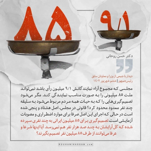 مجلسی که مجموع آراء نمایندگانش ۹/۱ میلیون رأی باشد نمیتواند ملت ۸۵ میلیونی را به صورت مناسب نمایندگی کند. مگر میشود تصمیمگیریهایی را که به حیات همه مردم مربوط میشود به سلیقه چند نفر معدود محدود کرد؟ قانونی در مجلس، اصل هشتاد و پنجی شده است در حالی که اجرای این اصل صرفاً برای موارد اضطراری و مصوبات آزمایشی است. تصمیمگیری برای ۸۵ میلیون ایرانی به چند نفری سپرده شده است که کل آرایشان به چند صد هزار نفر هم نمیرسد. آیا اینها شرعاً و عرفاً میتوانند از طرف ۸۵ میلیون نفر تصمیم بگیرند؟