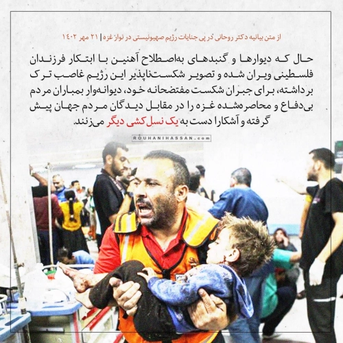 رئیسجمهوری روز پنجشنبه در پیامی به اجتماع «کودکان غزه، کودکان ایران»، فاجعه غزه را نه کشتار انسانها بلکه قتلعام انسانیت دانست و تصریح کرد: دولتهای غربی باید برای جلوگیری از این نسلکشی بزرگ با کنار گذاشتن منافع و مطامع مادی و سیاسی خود، با مردم و کشورهای آزادیخواه جهان همراهی کنند.