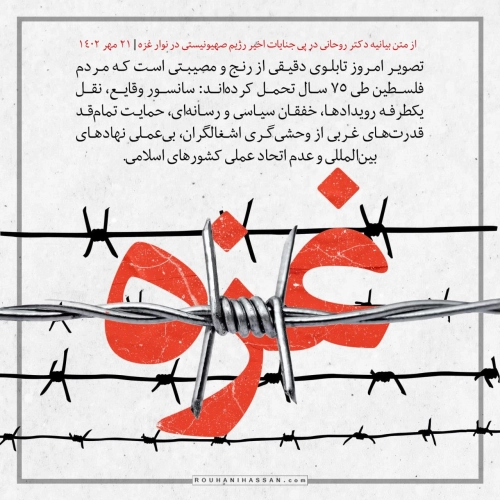 تصویر امروز تابلوی دقیقی از رنج و مصیبتی است که مردم فلسطین طی ۷۵ سال تحمل کردهاند: سانسور وقایع، نقل یکطرفه رویدادها، خفقان سیاسی و رسانهای، حمایت تمامقد قدرتهای غربی از وحشیگری اشغالگران، بیعملی نهادهای بینالمللی و عدم اتحاد عملی کشورهای اسلامی.