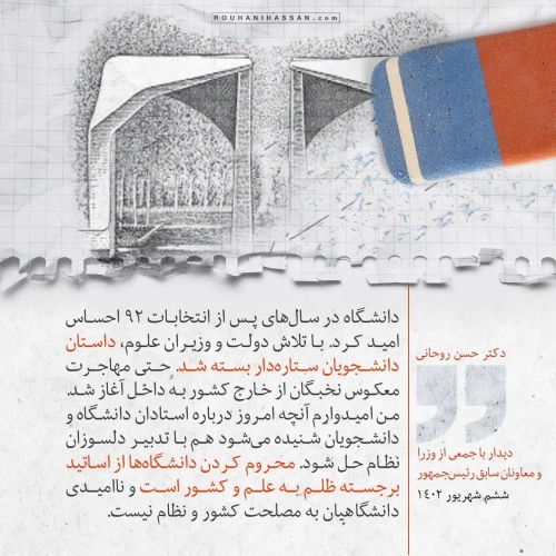 دانشگاه در سالهای پس از انتخابات ۹۲ احساس امید کرد. با تلاش دولت و وزیران علوم، داستان دانشجویان ستارهدار بسته شد. حتی مهاجرت معکوس نخبگان از خارج کشور به داخل آغاز شد. من امیدوارم آنچه امروز درباره استادان دانشگاه و دانشجویان شنیده میشود هم با تدبیر دلسوزان نظام حل شود. محروم کردن دانشگاهها از اساتید برجسته ظلم به علم و کشور است و ناامیدی دانشگاهیان به مصلحت کشور و نظام نیست.